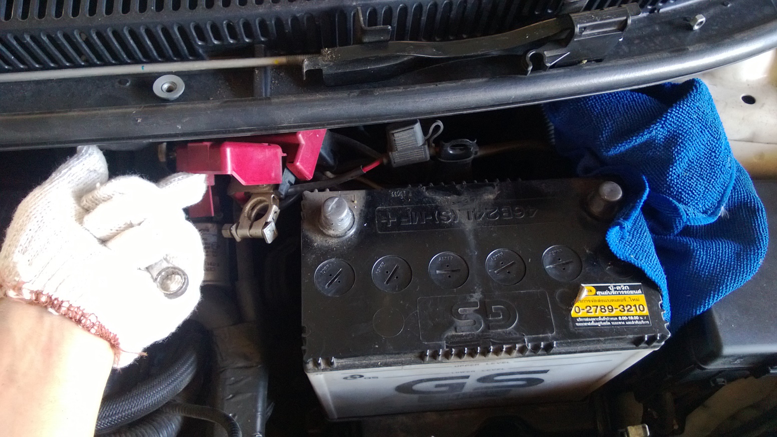 - ทำความสะอาดขั้วแบตเตอรี่ทั้งขั้วบวกและขั้วลบ โดยใช้น้ำร้อนราดที่ขั้วแบตเตอรี่ทั้ง 2 ขั้ว เพื่อขจัดคราบเกลือที่เกาะติดอยู่